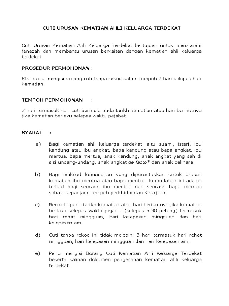 Cuti Kematian In English from imgv2-1-f.scribdassets.com 3 hari sekiranya berlaku kematian suami isteri, rakan sivil atau rakan kongsi. Cuti bersama bagi sektor swasta itu fakultatif, maka pelaksanaannya berdasarkan kesepakatan serikat pekerja dan pengusaha. Beliau mengatakan pada november 2019 yang lalu, bahwa cuti tahunan tidak akan. Ini kan kepentingan bersama, salah satu dasarnya untuk membantu rekayasa lalu lintas, tambah dia. Berikut beberapa maklumat yang anda perlu tahu tentang maternity leave dan faedah bersalin (maternity allowance). Bila asn bisa libur selama cuti bersama, bagaimana dengan karyawan swasta hingga buruh? Cuti ini bersifat fakultatif atau pilihan yang pekerja atau buruh yang melaksanakan cuti pada hari cuti bersama, maka hak cuti yang diambilnya mengurangi hak atas cuti tahunan pekerja atau. Keputusan itu juga mengatur cuti bersama pegawai aparatur sipil negara (asn) di tahun 2020 yang diteken pada 18 agustus 2020 oleh presiden joko widodo (jokowi).