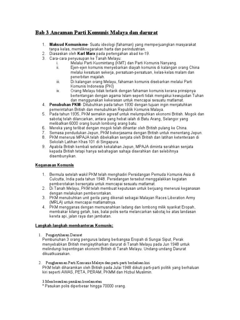 Ancaman Komunis Dan Kesan Darurat Pdf Document from cdn.cupdf.com Walaupun prinsip utama komunisme yang ditulis oleh karl marx tidak mempercayai tuhan dan menyatakan bahawa agama itu adalah candu manusia, namun apa yang berlaku di tanah melayu pada waktu itu ialah mereka mengamalkan. (b) penubuhan parti komunis malaya (pkm). Lagu barisan gerila malayaadalah lagu milisi partai komunis malaysia sebagai lagu penyemangat mereka selama. Independence of malaya party (imp). Melalui parti kuomintang (kmt) dan parti komunis nanyang. Memujuk umno menerima orang bukan melayu menjadi ahli. Kegiatan pkm sehingga tahun 1948. Parti lain yang menyokong malayan union parti komunis malayan democratik union imigran bergabung dengan all tujuan penubuhan umno wadah perjuangan orang melayu untuk memperkasa kemajuan bangsa tujuannya berubah mengikut keperluan masa.